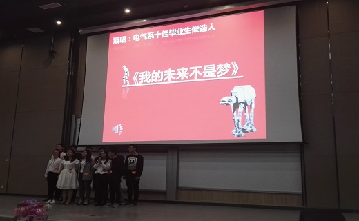 接下来主持人向大家介绍本次活动的评分规则,同时结合在校综合评分、网络投票得分以及现场评委、学生代表评分组成,本次评选本着公平公正公开的理念,旨在选出今年最具代表性的优秀人物,活动有条不紊的进行,各位选手在场上发挥自己的激情和热情,其中,比赛中的歌曲《纸短情长》让人眼前一亮,评选结束后,十佳毕业生候选人一起齐唱《我的未来不是梦》,为比赛画上完美的句号。