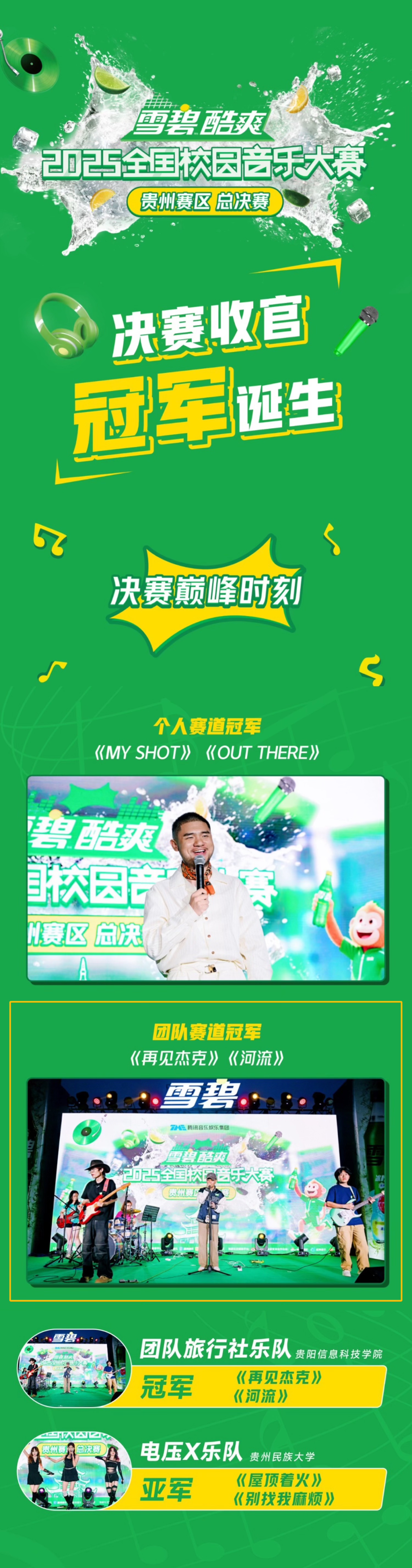 6月1日,“雪碧酷爽2025全国校园音乐大赛”贵州赛区总决赛成功落下帷幕。我校音乐协会学生余思豪、王松、杨紫龙、罗子彤、马安琪、李应勇组成的“团队旅行社乐队”经历海选、半决赛的层层选拔,在全省上千名选手中脱颖而出,成功晋级决赛,并以独特的音乐风格和极具感染力的表演,一举夺得团体赛道冠军,为学校赢得了荣誉。