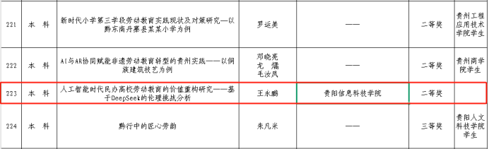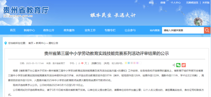新闻网讯(供稿/供图 党群工作部)近日,贵州省第三届中小学劳动教育实践技能竟赛系列活动评审结果出炉,本届赛事共收到涵盖短视频创作、绘画、摄影、论文等四大类参赛作品逾千件,经专家评审委员会严格遴选,最终评选出597件获奖作品。我校师生凭借扎实的劳动教育实践成果,在本次大赛中喜获一等奖3项、二等奖3项、三等奖1项的优异成绩。