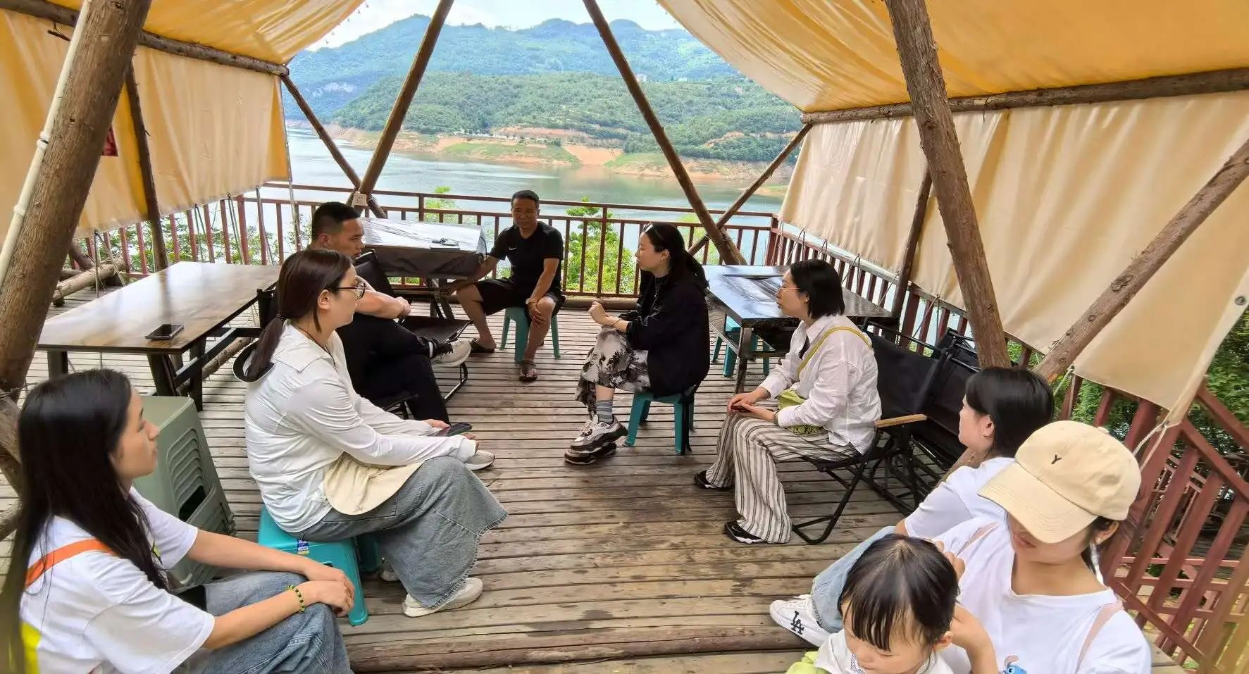 老师和同学在鸭甸河村露营基地商讨产品包装设计方向