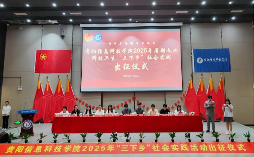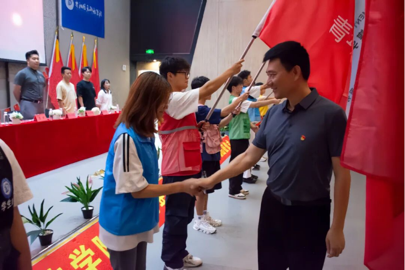 仪式的高潮环节,校党委副书记詹凯为各实践队授旗,自此,我校2025年大学生暑期“三下乡”社会实践活动正式启航。
