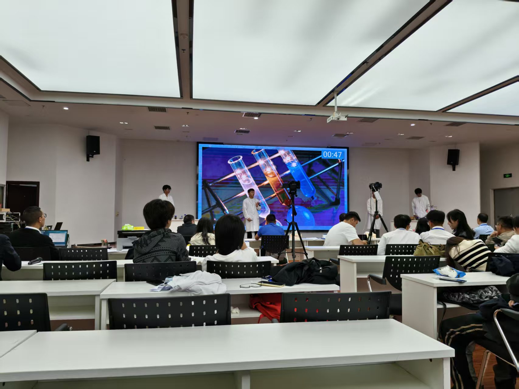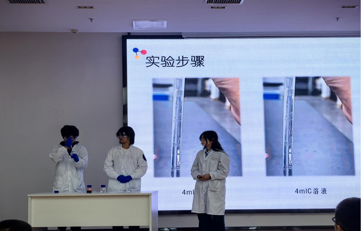 比赛中,面对来自全省的各路强队,我校参赛选手沉着冷静、稳定发挥。在实验展演汇演环节,团队成员运用娴熟的实验操作技能,幽默风趣又不失科学严谨的语言表达,将复杂的科学原理转化为科普作品,生动形象地展示了整个实验过程,赢得了评委和观众的广泛好评。