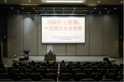 新闻网讯(供稿/供图 学生工作处)10月27日晚,贵州省国防教育讲师团成员、贵州大学人民武装学院军事理论研究院院长赵永伦教授在我校图书馆报告厅开展国际安全形势与中国周边安全形势国防教育讲座。赵永伦通过详实的资料、广博的军事知识,深刻分析了当前国际安全形势与中国周边安全态势,引发师生热烈反响,讲座共计400余人参加。