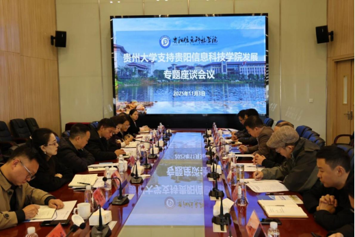 新闻网讯(供稿/供图 党政办)为深化校际协作,精准助推学校高质量发展,11月3日,贵州大学党委副书记张大林率领贵大党委办公室、校长办公室、人事处、对外合作处、财务处、教务处、法律顾问室、网络与信息管理中心等部门负责人到我校开展对口帮扶交流。我校理事会副理事长邱军,校长唐建荣,党委副书记詹凯等领导以及相关部室负责人参加交流会议。双方聚焦学科建设、师资培养、资源共享、产教融合等重点领域深入探讨校际协作路径,并签署合作协议。