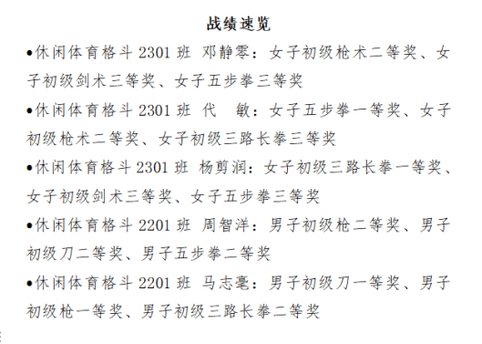 比赛期间,面对全省武林精英的激烈角逐,我校学子始终沉着冷静、从容应战。他们将平日训练的汗水与积累,精准转化为赛场上的实力, 出拳刚劲有力、舞剑行云流水、持枪沉稳利落,每一招式都凝聚着专注与坚持,每一次亮相都展现着专业水准,最终以亮眼战绩交出精彩答卷;同时因严守赛场规则、尊重对手与裁判,以卓越体育素养获评 “体育道德风尚奖”,实现竞技成绩与精神文明的双重丰收!