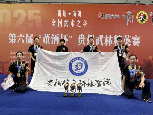 新闻网讯(供稿/供图 公共教学部)11 月 2 日,第六届 “董酒杯” 贵州武林精英赛在贵州清镇圆满落下帷幕。由我校陈晓梅教授专业指导,包健、蒙品闯老师带领的 5 人小队(邓静零、代敏、杨剪润、周智洋、马志毫),凭借扎实的武学功底、顽强的竞技意志,最终斩获 4 枚金牌、6 枚银牌、5 枚铜牌。
