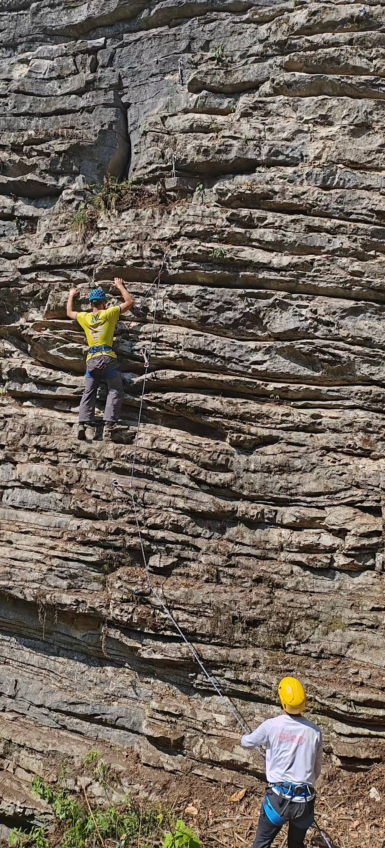 贵阳信息科技学院攀岩救援实训场(自然场地)位于学校南侧的自然山体区域,占地面积1500平方米,均高30米。场地依托天然山体的地形地貌,保留了岩石纹理多样、坡度变化丰富的自然攀岩环境,还原了野外攀岩的真实场景。这里主要用于学生的课后进阶训练与综合能力提升,学生可在此开展复杂地形攀岩、野外救援模拟、应急处置等高强度实训内容,通过应对自然环境中不确定的攀岩挑战,锤炼野外攀岩实战能力和突发状况下的救援协作能力,实现从基础技能到实战能力的跨越。