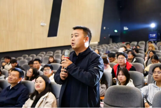 师生代表与主创团队的互动交流成为现场亮点。数字传媒学院视觉2402班龙利丹提问:“面对不了解王阳明的年轻观众,团队如何让话剧保持吸引力?”雷欣回应,创作中始终避免生硬的哲学说教,而是聚焦人物面对困境的抉择,“年轻人能从他身上看到坚守本心的力量,这就是最朴素的共鸣点”。土木工程学院工管2501班禹富豪好奇主演的角色塑造秘诀,张鹏霄坦言,为贴近人物,他不仅闭门研读史料,更在每一场演出中结合观众反馈调整状态,“第五十场的王阳明,比第一场多了更多温度,这也是‘知行合一’在表演中的实践”。