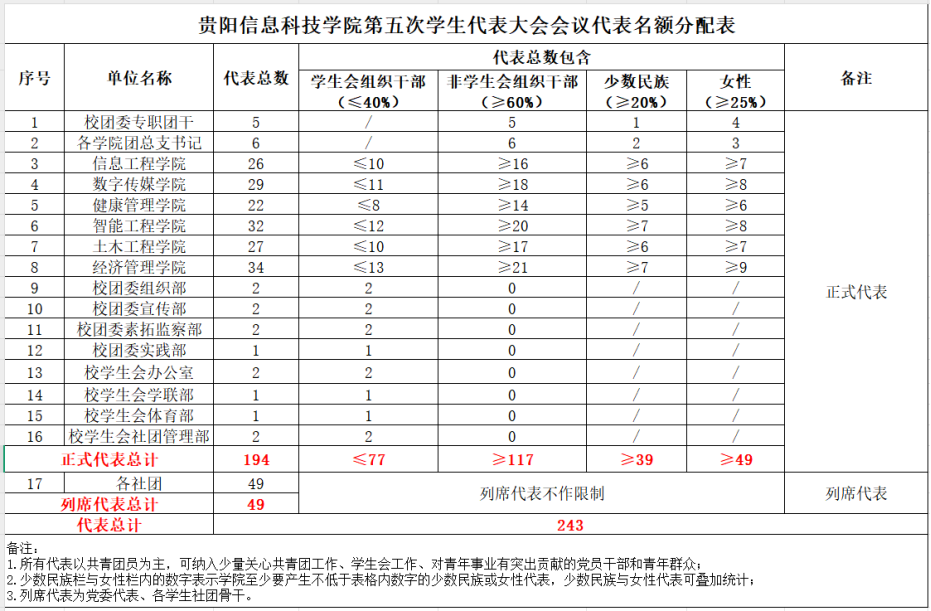 根据《关于推动高校学生会(研究生会)深化改革的若干意见》《普通高等学校学生(研究生)代表大会工作规定》中“学代会代表名额不少于全校总人数1%”的规定,贵阳信息科技学院第五次学生代表大会代表名额拟定为194名。我校下属团组织共有团员6046名,代表名额的分配根据团员人数和代表具有广泛性的原则确定。