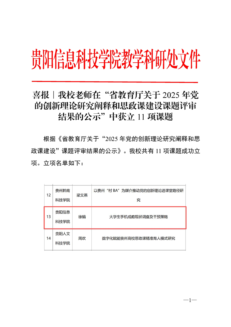 喜报∣我校老师在“省教育厅办公室关于公布2025年贵州省教育科学规划年度课题暨粤黔专项课题立项名单的公告”中获立4项课题