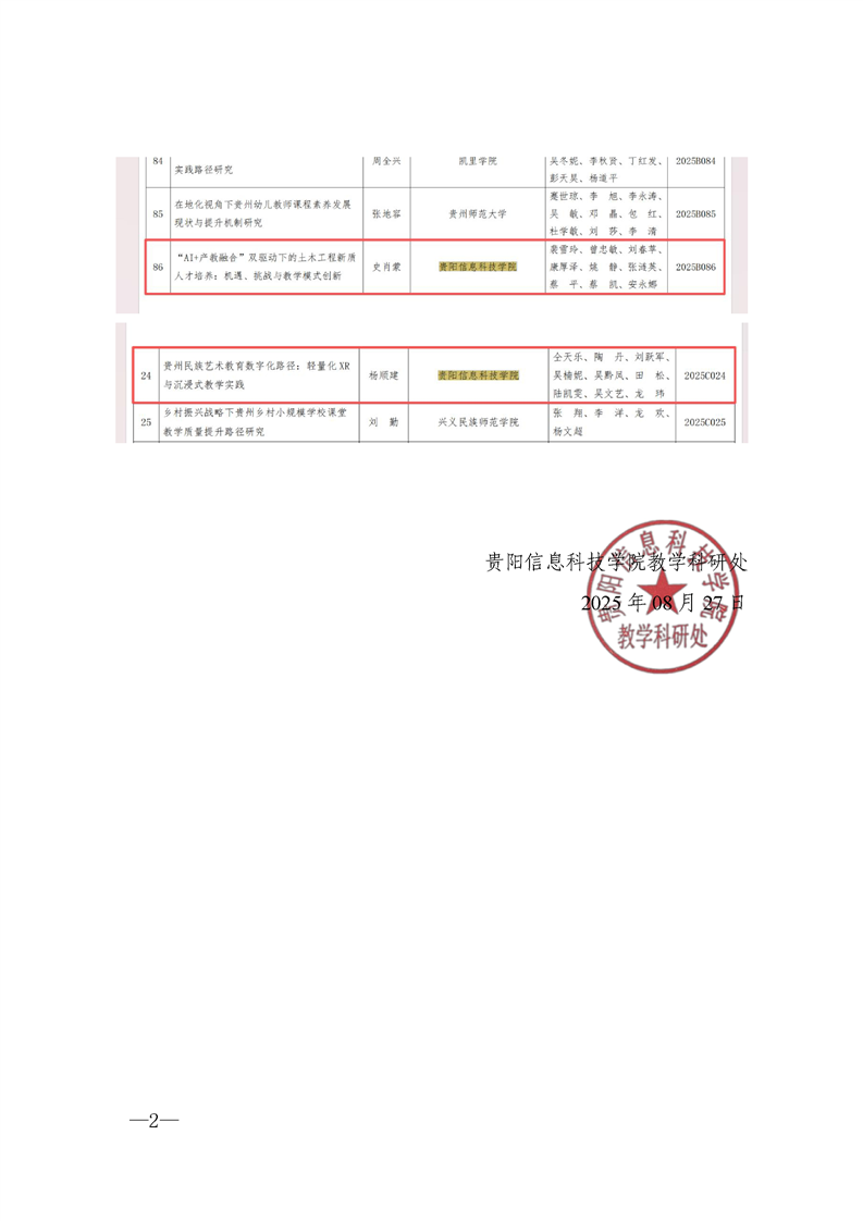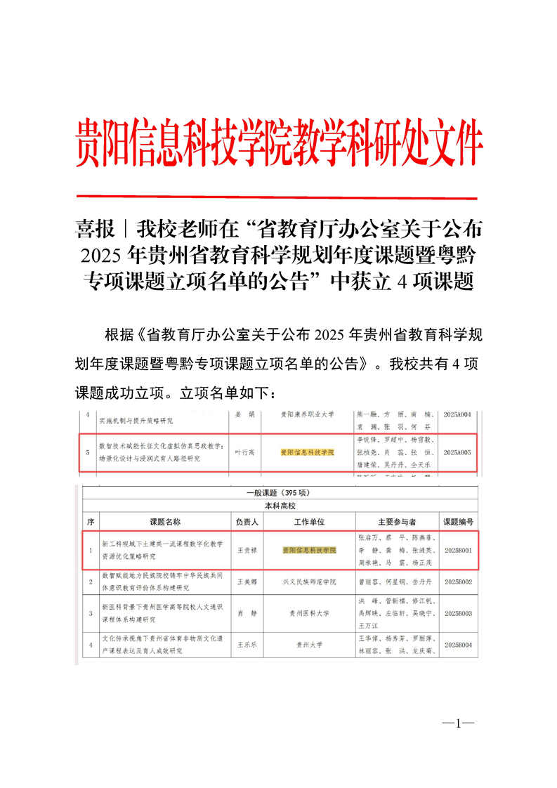 喜报∣我校老师在“省教育厅办公室关于公布2025年贵州省教育科学规划年度课题暨粤黔专项课题立项名单的公告”中获立4项课题