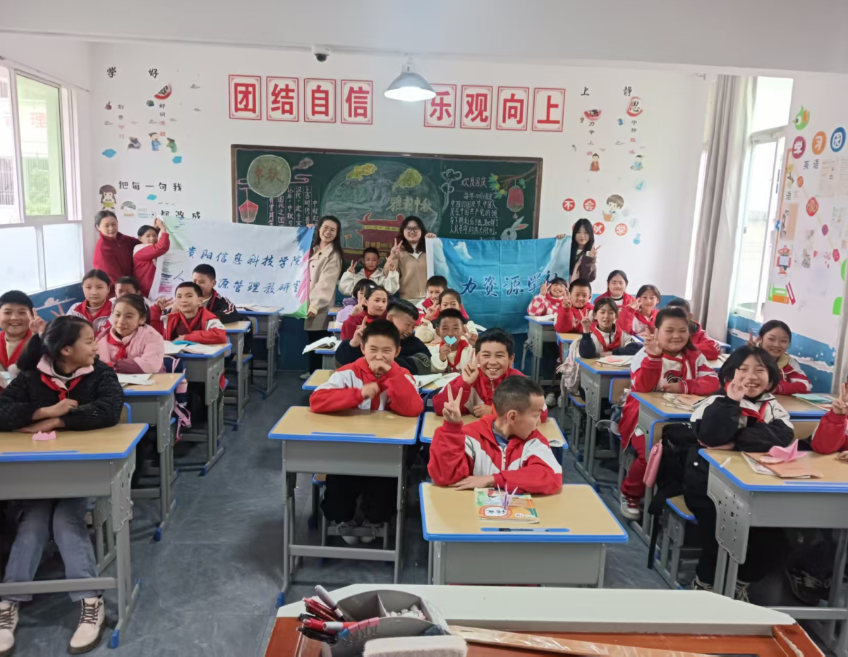 2025年11月11日贵阳信息科技学院经济管理学院人力资源管理教研室周安萍、李金霞老师前往贵阳市贵安新区圣泉小学开展一场与众不同的“职场宣讲”。当PPT页面展开,孩子们稚嫩的面庞被AI合成到一张张成熟的职业工作照中。在孩子们欢呼的时候,我们不禁去探寻儿童内心最真实的想法。