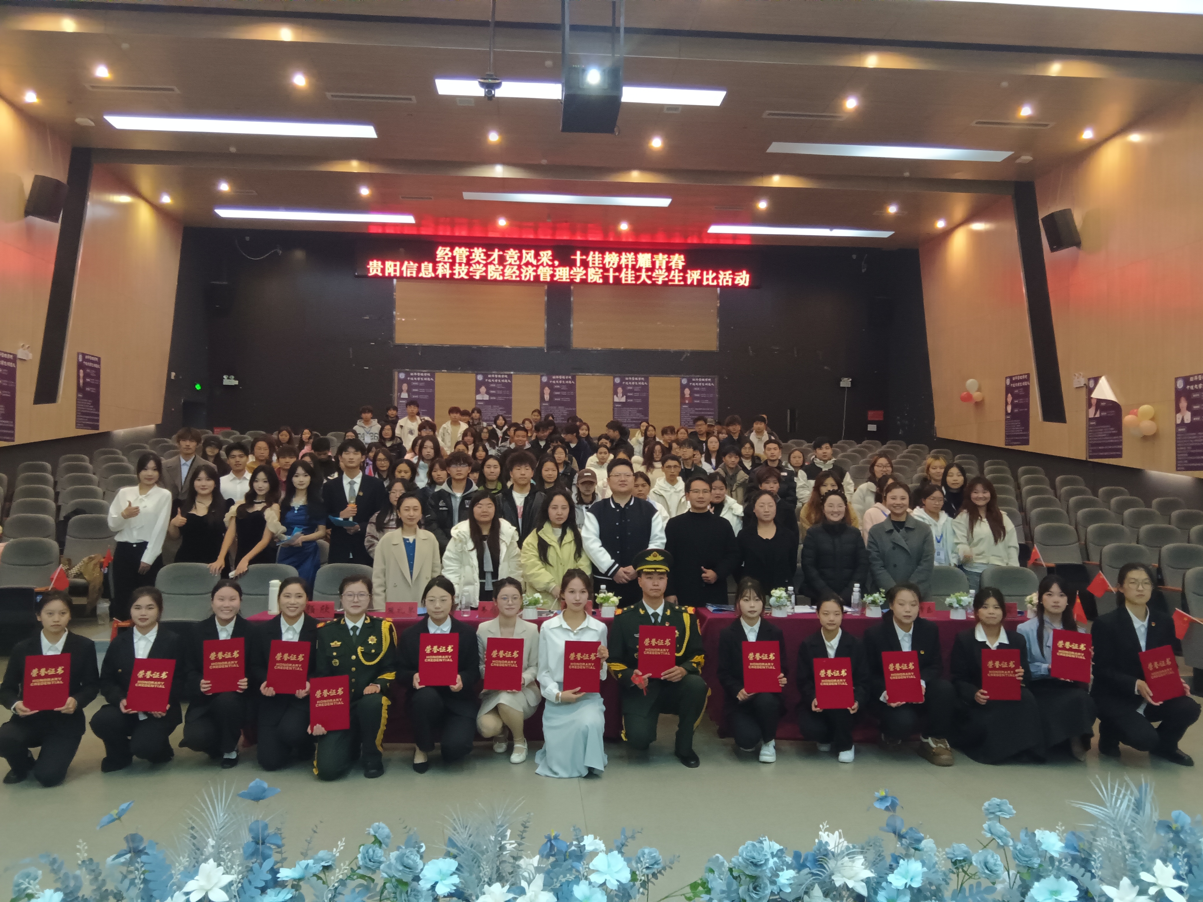 新闻网讯(供稿 袁思诗 供图 李飞璇 石梦花)为挖掘校园优秀学子典型、弘扬勤学笃行之风,2025年11月11日,贵阳信息科技学院经济管理学院成功举办“十佳大学生”评选活动。活动特邀学院领导、教师代表及学生代表组成评审团,吸引200余名师生到场见证青春榜样诞生。评审团成员由经济管理学院党总支书记莫建活、学院办主任韦雅菁、学工办主任郭东越、学生工作处老师熊礼琴、团总支书记颜欣,辅导员张修乐、苏丽飞、杨慧,以及六大学院学生会主席代表、校团委学生代表组成。