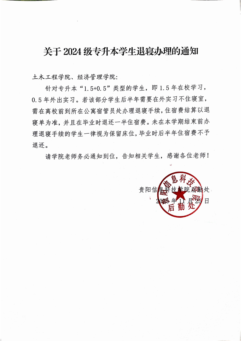 关于2024 级专升本学生退寝办理的通知
