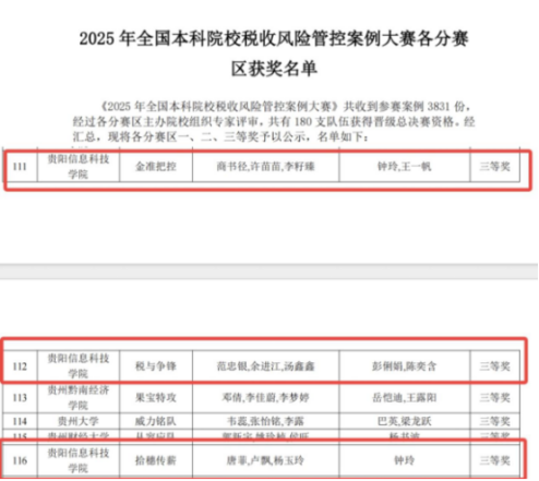 新闻网讯(供稿/供图 经济管理学院)近日,2025年全国本科院校税收风险管控案例大赛分赛区评审结果正式揭晓。我校经济管理学院组建商书径团队(商书径、许苗苗、李籽臻)、范忠银团队(范忠银、余进江、汤鑫鑫)、唐菲团队(唐菲、卢飘、杨玉玲)3支参赛队伍,在钟玲、王一帆、彭俐娟、陈奕含等专业教师的悉心指导下,参赛学生凭借扎实的专业知识储备和出色的实践应用能力,从众多参赛队伍中脱颖而出,全部荣获贵州赛区三等奖,以亮眼成绩彰显了学校财税领域专业人才培养的显著成效。