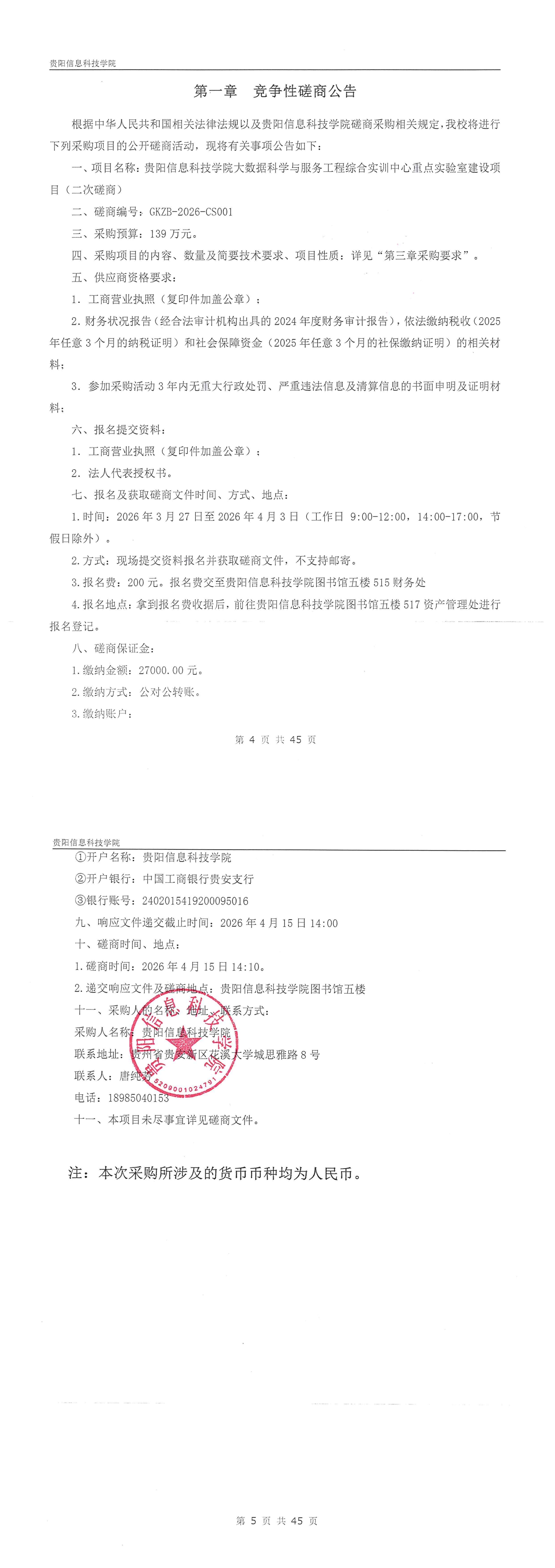 贵阳信息科技学院大数据科学与服务工程综合实训中心重点实验室建设项目竞争性磋商公告