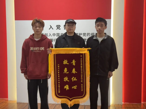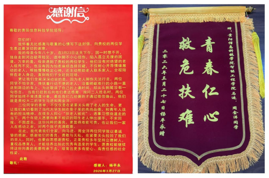 事后,老人家属杨先生专程来到学校,向周金洋、马进两名同学表达诚挚谢意,亲手送上锦旗和感谢信。感谢信中写道:“两位同学不仅及时帮助老人脱离困境,更挽回了一个家庭的完整,让家属深切感受到当代大学生的责任与担当、善良与热忱。”朴实的文字饱含真情,既是对两名学子善举的高度肯定,也是社会对我校人才培养成果和学子良好素养的充分认可。