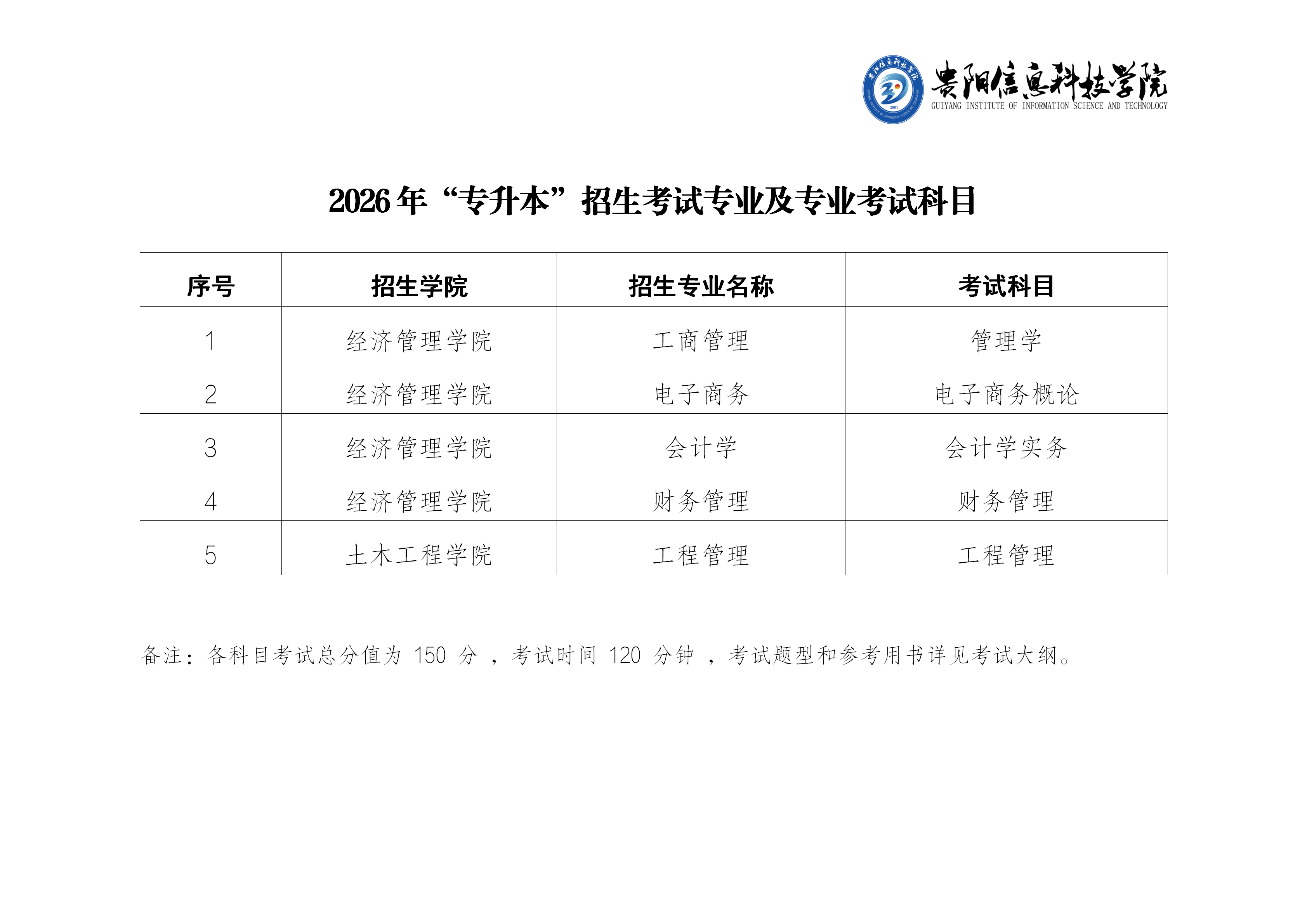 贵阳信息科技学院 2026 年“专升本”招生考试专业及专业考试科目