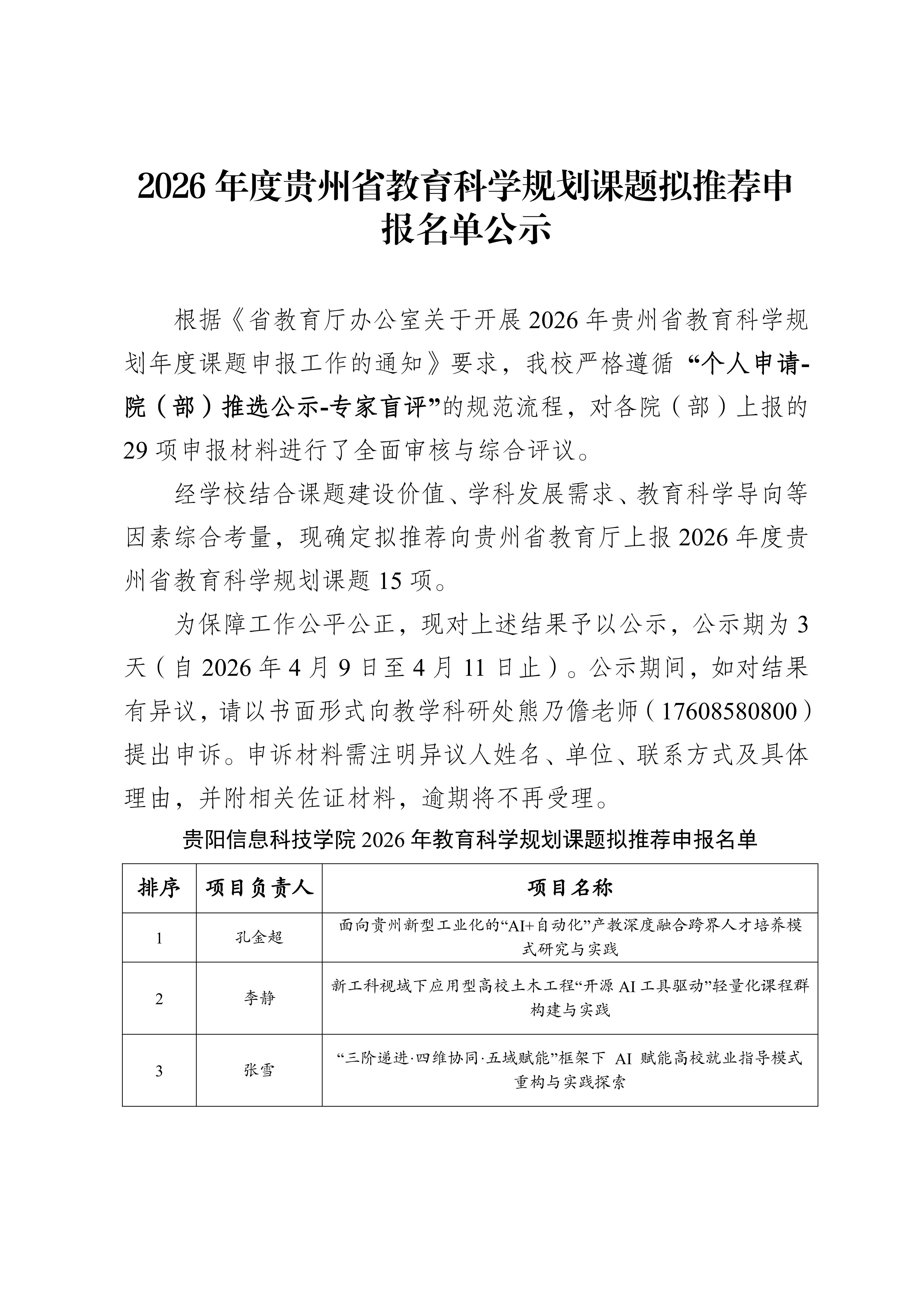 2026年度贵州省教育科学规划课题拟推荐申报名单公示