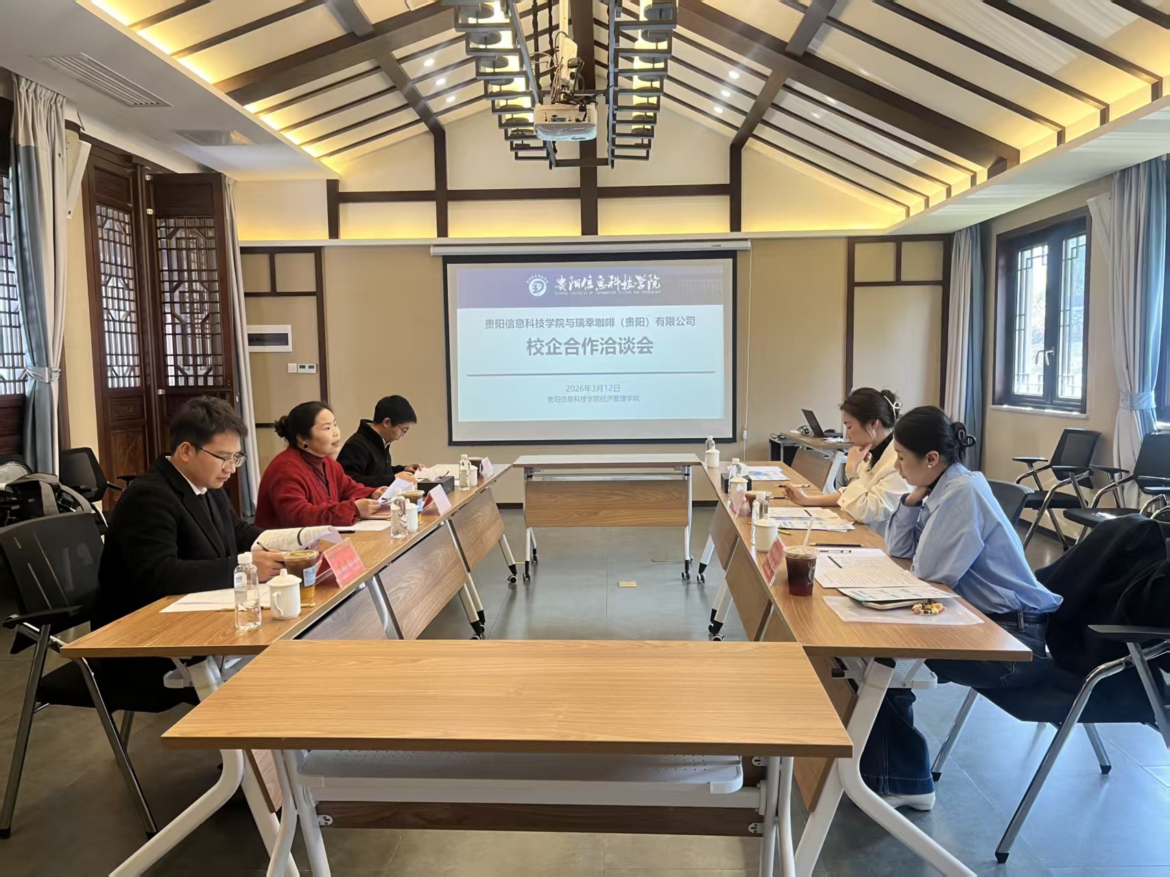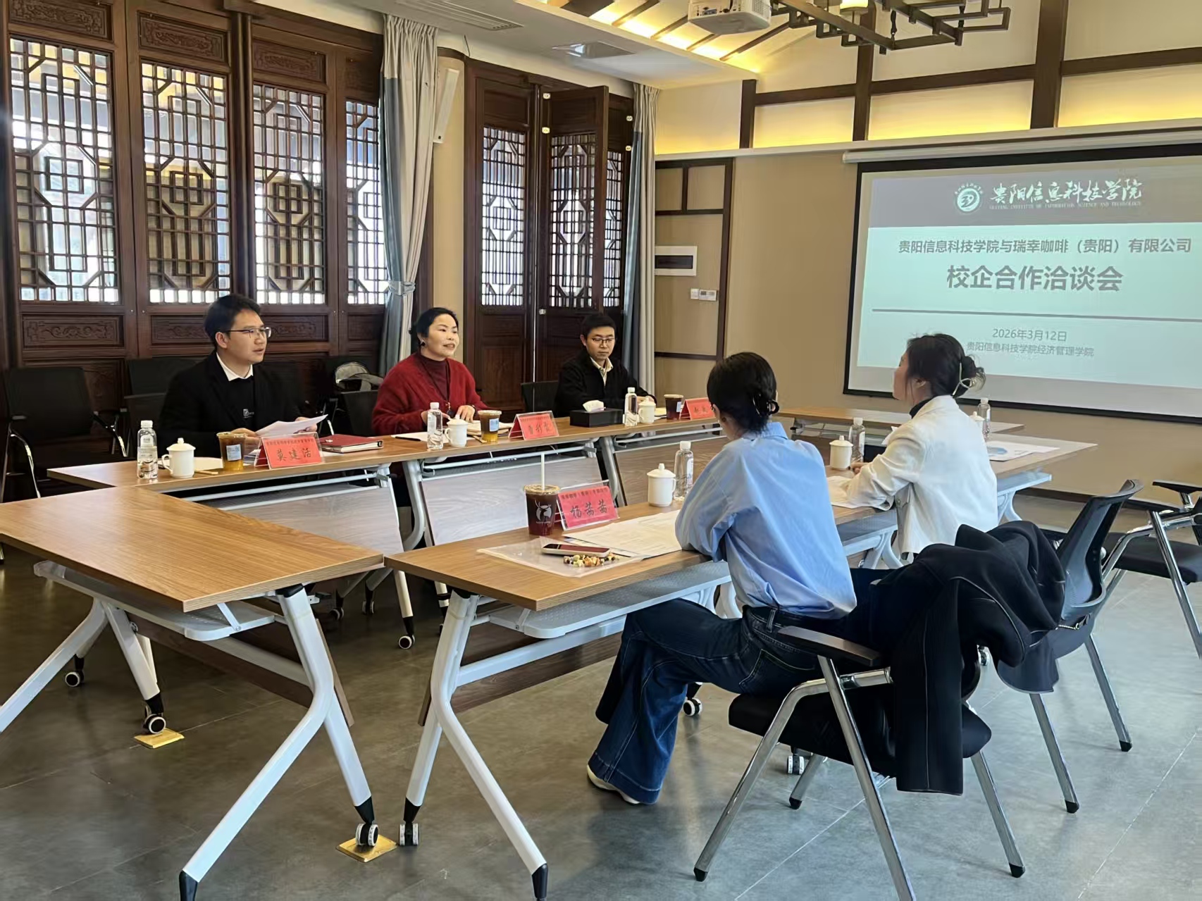 新闻网讯(供稿/供图 赵政)为深入推进访企拓岗专项行动,深化产教融合、校企合作,切实拓宽学生实习与就业渠道,3月12日,贵阳信息科技学院经济管理学院与瑞幸咖啡(贵阳)有限公司在学校阳明书院会议室举行校企合作深度洽谈会。经济管理学院院长曹彩霞、党总支书记莫建活、就业老师赵政,瑞幸咖啡人力资源总监李文平、杨茜茜等出席会议。