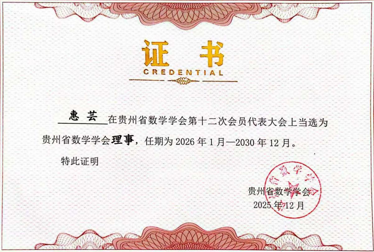 2025年12月6日,贵州省数学学会第十二次会员代表大会暨2025年学术年会在贵阳隆重召开。经大会民主选举与严格审议,我校成功当选贵州省数学学会第十二届理事会理事单位,公共教学部惠芸老师当选学会理事,任期为2026年1月至2030年12月。此次当选,是省数学学会对我校数学学科建设、学术影响力及人才培养成果的充分肯定,标志着我校在贵州省数学领域的行业地位与话语权得到进一步提升,为学校数学学科高质量发展搭建了平台。