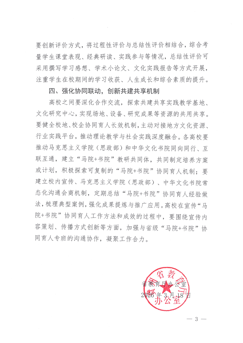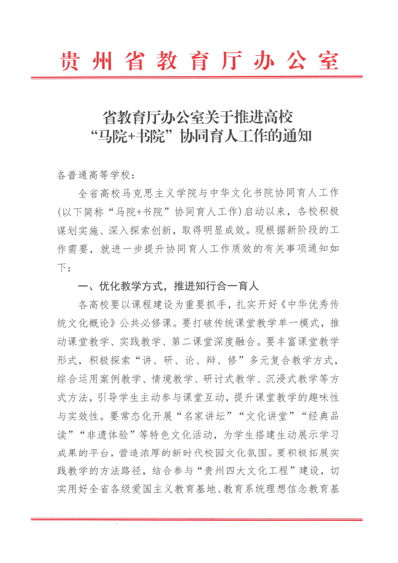 省教育厅印发《关于全省高校推进马克思主义学院和中华文化书院协同育人工作的指导意见》的通知