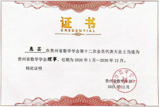 新闻网讯(供稿/供图 公共教学部)在贵州省数学学会第十二次会员代表大会上,经大会严格审议和民主选举,我校成功当选贵州省数学学会第十二届理事会理事单位,公共教学部惠芸老师当选学会理事,任期为 2026 年 1 月至 2030 年 12 月。此次当选,是省数学学会对我校数学学科建设、学术影响力及人才培养成果的充分肯定,标志着我校在贵州省数学领域的学术地位与影响力得到进一步提升,为学校数学学科高质量发展搭建了重要平台。