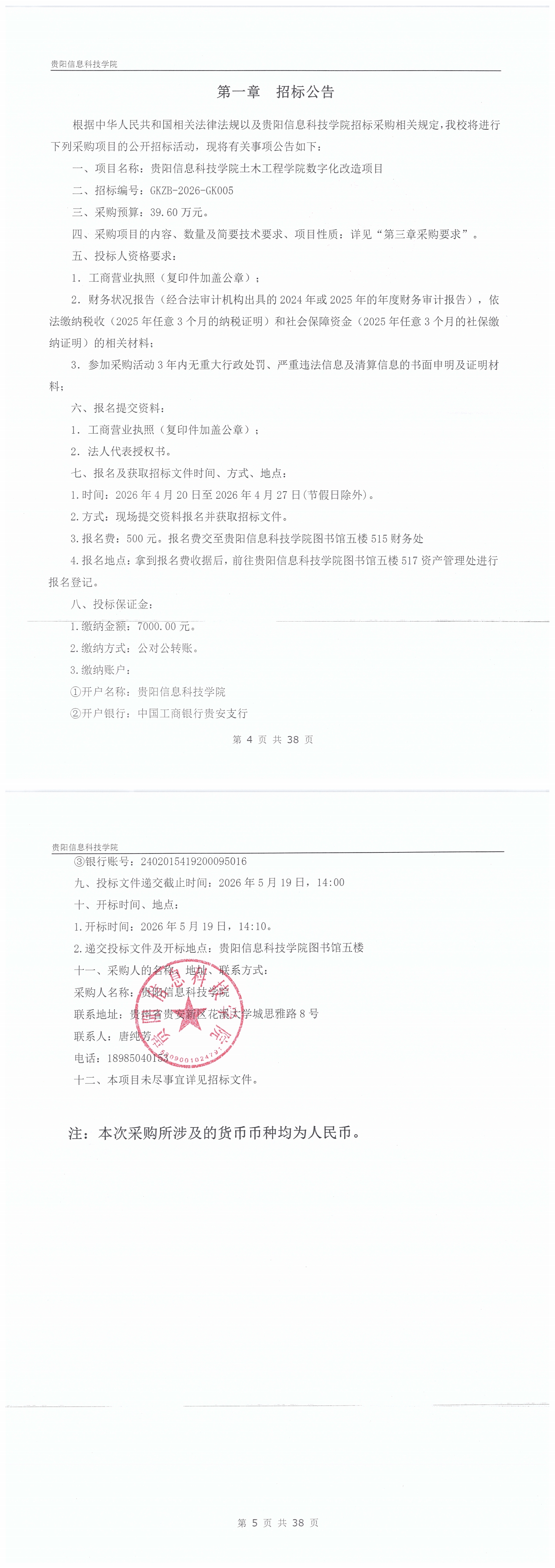 贵阳信息科技学院土木工程学院数字化改造项目招标公告