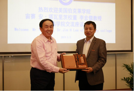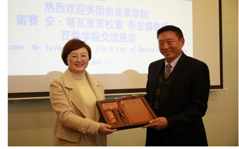 (党委书记郭林桦向美国伯克莱学院全球联盟首席执行主任李宏儒教授赠送伴手礼)