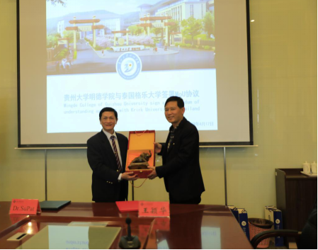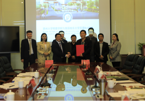 素帕简单介绍了格乐大学的发展现状。泰国格乐大学中国国际事务中心主任崔光明表示,明德学院的合作理念与泰国格乐大学不谋而合,两校有共同目标和彼此感兴趣的话题。为响应“一带一路”战略发展方针,目前泰国格乐大学已成立“中国-东盟教育研究中心”,希望与我院的“教育部‘区域和国别研究基地’贵州大学东盟研究院明德一带一路研究中心”在课题研究上对接。两校在2+2双学位项目、本硕连读项目、教师学历提升项目上展开了讨论,旨在提高创新人才教育质量,促进两校共同发展,共同推进中泰两国地区间高等教育合作的创新与发展。