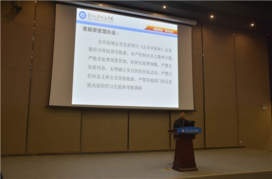 杨兵荣围绕学院“财务管理制度”进行培训。他深入浅出地讲解了学院的差旅费报销办法、票据支出相关规定、票据填写、票据粘贴规范等财务业务知识,还就财务监督、内控和风险管理监督等财务方面的问题进行了全面系统的讲解,同时,对学院实际工作开展中遇到的问题图文并茂地逐一进行了解答。