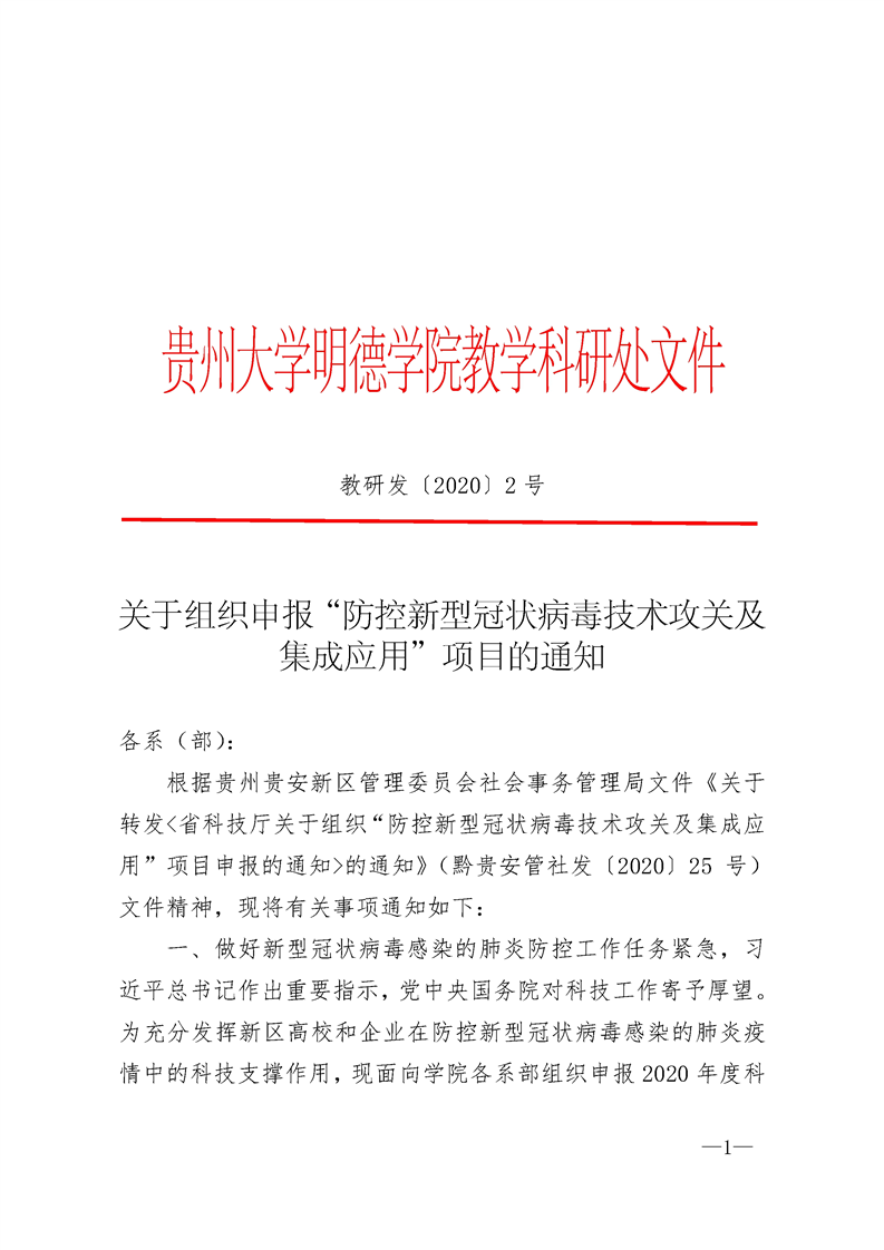 附件:黔贵安管社发〔2020〕25号 关于转发《省科技厅关于组织“防控新型冠状病毒技术攻关及集成应用”项目申报的通知》的通知.pdf