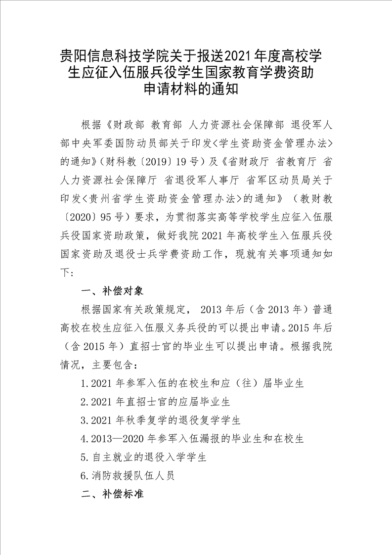 贵阳信息科技学院关于报送2021年度高校学生应征入伍服兵役学生国家教育学费资助