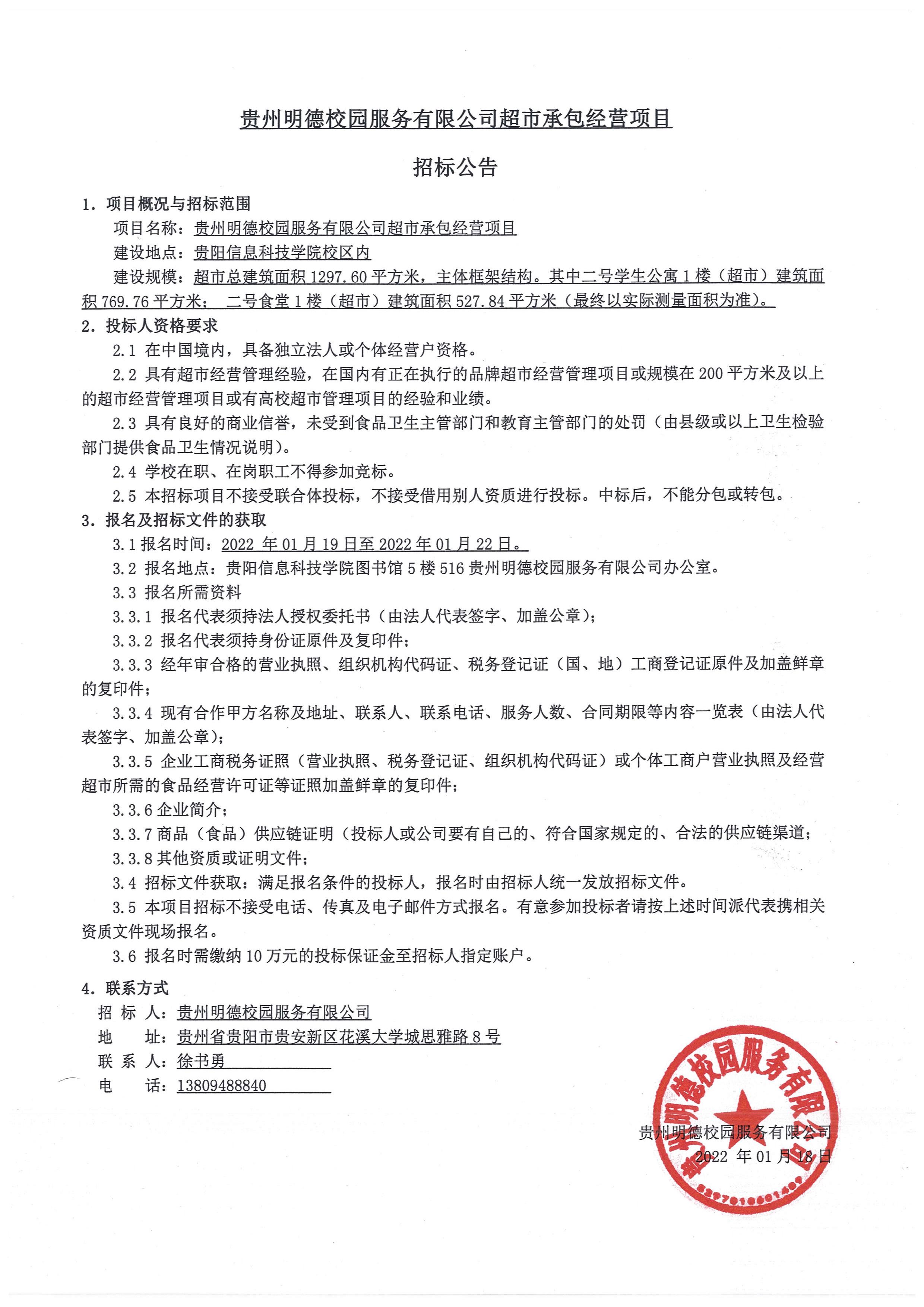 贵州明德校园服务有限公司超市承包经营项目招标公告