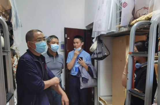 奋战“疫”线,勇做疫情防控领头雁。校领导班子主动作为、奋战在前,带头执行防控要求、积极参与学校疫情防控工作,在疫情防控一线践行初心使命,展现担当作为。从9月1日到9月6日,学校共开展3次全员核酸检测,2次重点人群核酸检测,每一次检测学校领导班子成员轮流到现场调度巡查,出现问题现场解决。此外,校领导还深入到学生宿舍了解学生诉求,到学校食堂、超市、店铺等查看物资供应和储备情况。9月4日,学校1名教职工和2名学生出现发烧症状,校领导身先士卒,立即开车护送生病的教职工和学生赶到大学城医院进行治疗(后经查为气温骤降导致的普通感冒发烧)。
