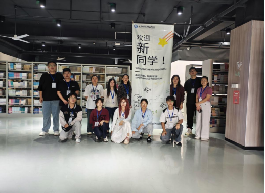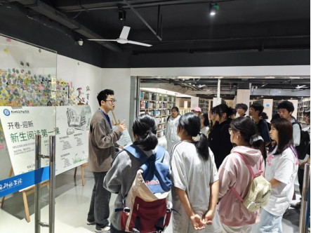 (图书馆新生入馆培训启动,师生在“欢迎新同学”展板前留影)