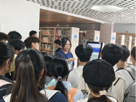 在三楼展开实地讲解时,主要了介绍馆藏布局情况、《中国图书馆分类法》、“第二课堂学分”图书借阅政策及借阅图书的方式和方法。培训中阐明,新生可通过定期借阅专业图书来积累必修的思想道德积分,此次举措不仅将阅读与个人成长评价体系直接挂钩,也在较大程度上激发了新生的借阅热情。