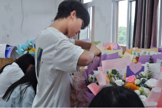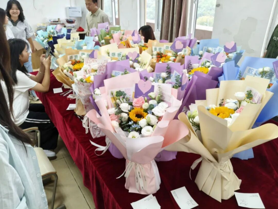 活动筹备阶段,同学们化身“心意传递者”,利用课后碎片时间投入到礼物制作中。大家精挑细选各色鲜花,从花材搭配到包装折叠,每一个细节都反复打磨;还在卡片上一笔一划写下“感恩您的悉心教诲”“老师,您辛苦了”等暖心话语,让每一束花束都承载着专属敬意。