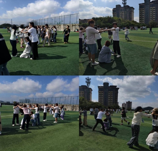 讲话结束后,素质拓展活动正式拉开帷幕。第一个项目是“贪吃蛇”热身游戏,规则简单易懂:学员们通过剪刀石头布定胜负,输的学员需紧跟在“蛇王”身后,随着参与人数逐渐增多,“小蛇”不断变长。