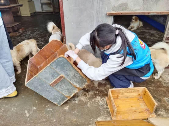 活动过程中,志愿者们身着蓝色马甲,如一群充满活力的“蓝精灵”,在指定地点准时集结。带队人员分发围裙、口罩等“战斗装备”,明确工作部署与安全注意事项后,志愿者们迅速组队,手持清洁工具“奔赴战场”,投入到流浪狗救助中心的清扫工作中。搬笼子、洗垫子、铲屎、拖地……一系列操作有条不紊,在这些小家伙“加油鼓劲”下,志愿者们忙得不亦乐乎。