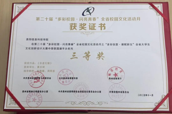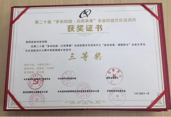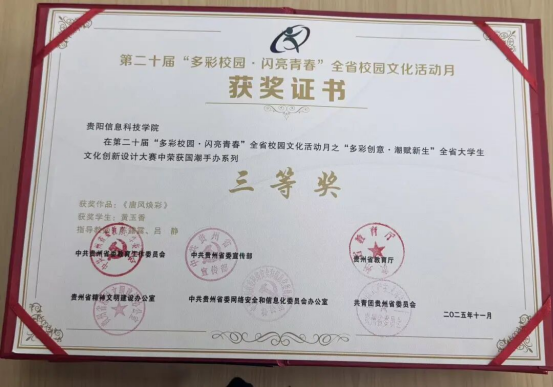 其中,我校师生在“多彩创意·潮赋新生”全省大学生文化创新设计大赛中荣获三项三等奖,在“黔心向党·红剧薪传”贵州省高校红色剧本杀创作大赛荣获三等奖。