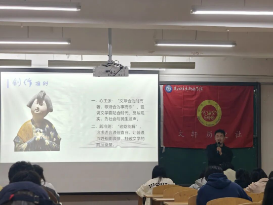 在讲解白居易环节,主讲人重点解读了新乐府诗作,阐述了其中蕴含的儒家仁政思想与社会批判精神,展现了士大夫阶层的社会担当。最后,通过对王勃《滕王阁序》的精彩解析,呈现了初唐文学承前启后、开拓创新的时代特质,以及骈文艺术达到的崭新高度。