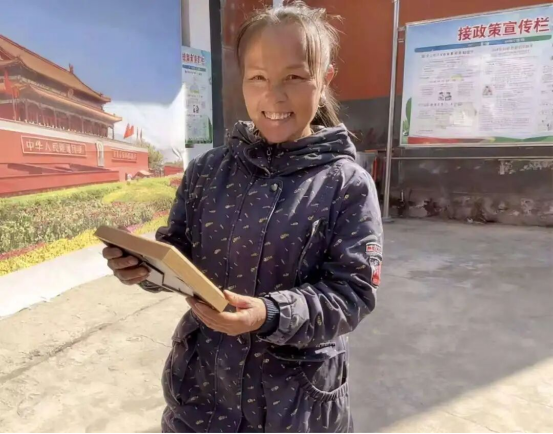活动现场,久安乡集市的院坝中,一面印着“天安门”图案的幕布格外醒目。冬日暖阳裹挟着山野清风,为镜头下的一张张笑脸镀上温暖光晕:牵着女儿小手的中年父亲指尖藏笑,挽着儿子臂膀的银发母亲皱纹里漾着温软,结伴而来的乡亲们勾肩并肩,将身影稳稳嵌入背景里的家国图景。志愿服务团队手持相机穿梭其间,精准捕捉每一个自然真挚的瞬间,现场细致修图调整光影、理顺衣角发丝,随后快速打印照片并装入木质相框。“活了大半辈子,头回和‘天安门’同框哩!”接过相框的老人反复摩挲着木纹,脸上的笑容质朴而真切。