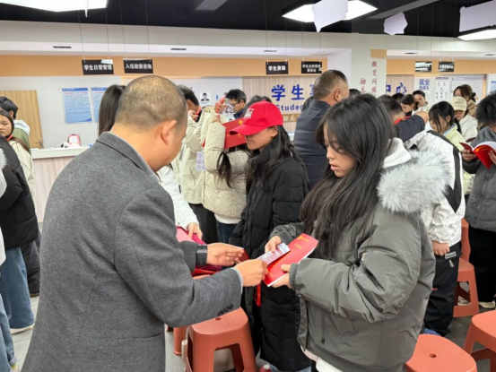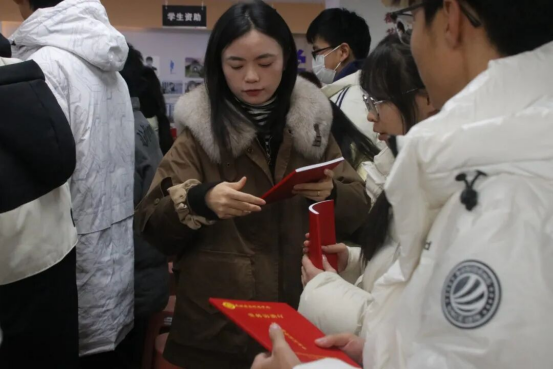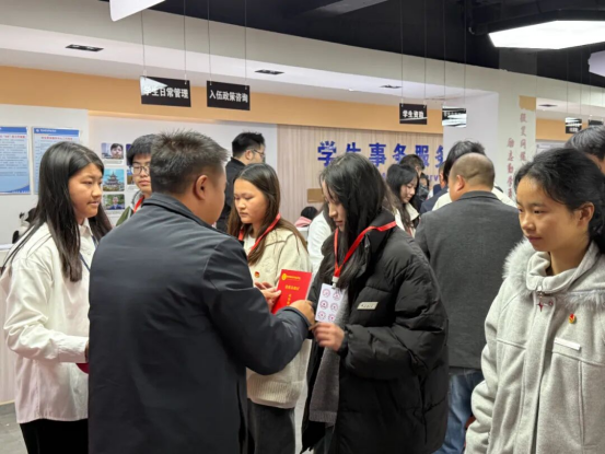在聘任环节,各职能部门负责人为全体民情调查员逐一佩戴工作证、颁发工作记录本。小小的工作证既是身份的象征,更是责任的直观体现,承载着学校的信任与广大同学的期盼。