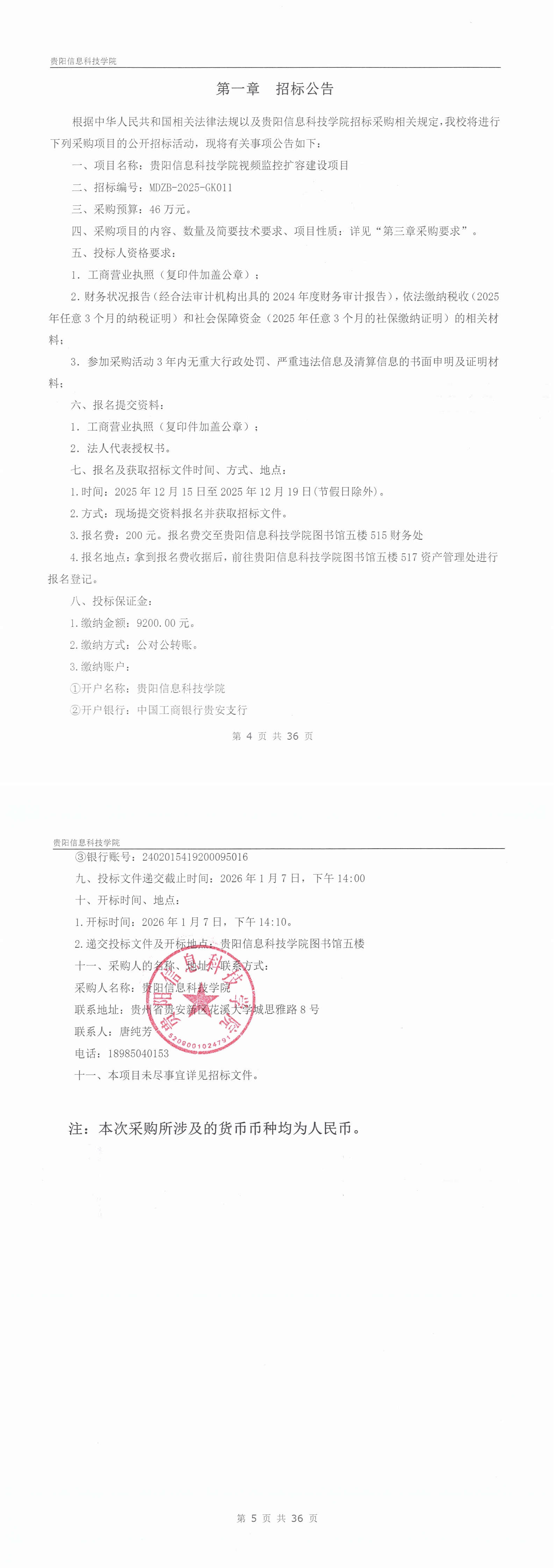 贵阳信息科技学院视频监控扩容建设项目招标公告