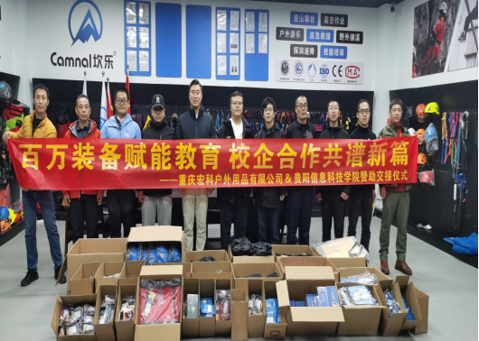12月11日下午,贵阳信息科技学院与重庆宏科户外用品有限公司、中探巅峰(北京)户外文化有限公司在重庆举行赞助器材交接仪式。我校副校长杨波带队,健康管理学院党总支副书记佟春雨及休闲体育教研室李建、张飞老师共同参与,标志着学校休闲体育专业产教融合建设取得实质性进展。