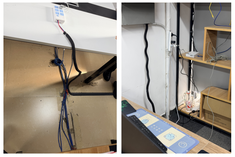 经检查,共发现8处安全管理不规范的情况,主要涉及:部分区域移动排插使用不当,甚至从墙上掉落;电源线与数据线散落于地面,容易导致绊倒或漏电等意外事故;实验室、工作室未设置实验室安全信息责任牌;安全出口有杂物堆积等。