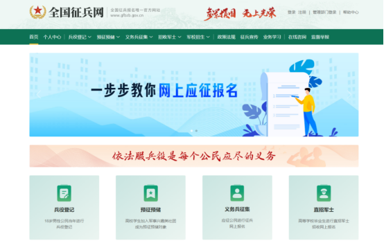 登录全国征兵网(https://www.gfbzb.gov.cn),男兵在应征报名之前,要先完成兵役登记。已完成兵役登记者可直接点击“义务兵征集”进入页面。