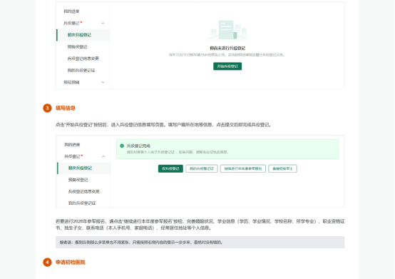 登录系统以后,点击右侧的“开始兵役登记”进行兵役登记。填写户籍所在地等信息,点击提交后即完成兵役登记。