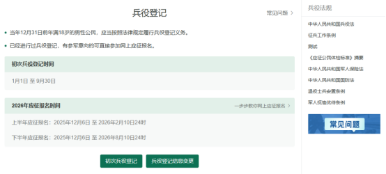 在这个页面中,会告知报名时间以及参军的政策说明,建议看完后,点击“初次兵役登记”完成登记。